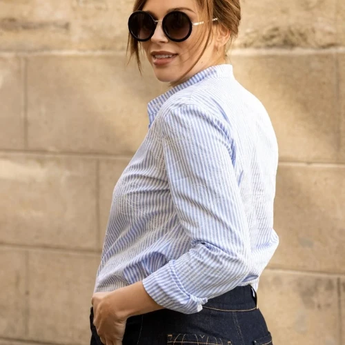 This white and blue striped maternity and nursing shirt with mao collar features embroidery made in Europe. With its buttons you can easily open your shirt to breastfeed your baby.