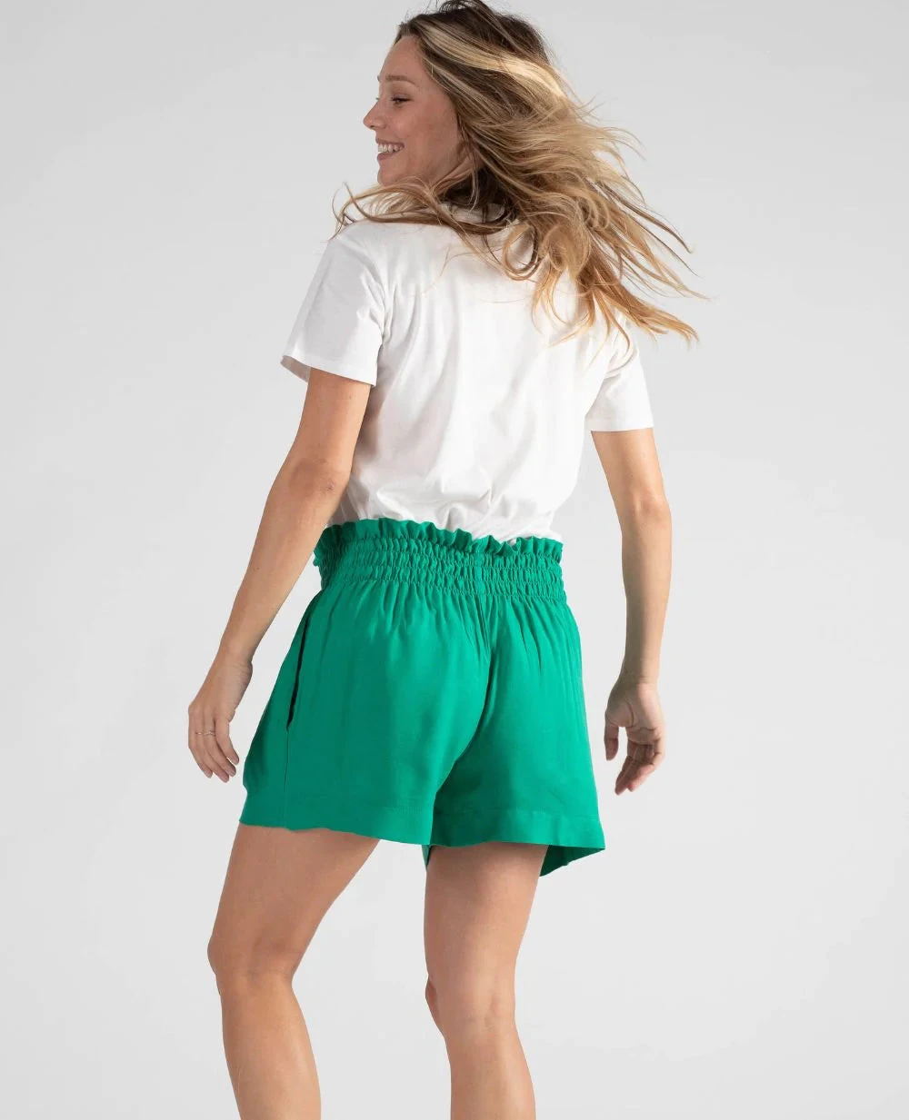 The green Nubie maternity shorts combine fluidity and comfort with their twill fabric and smocked elasticated waistband.