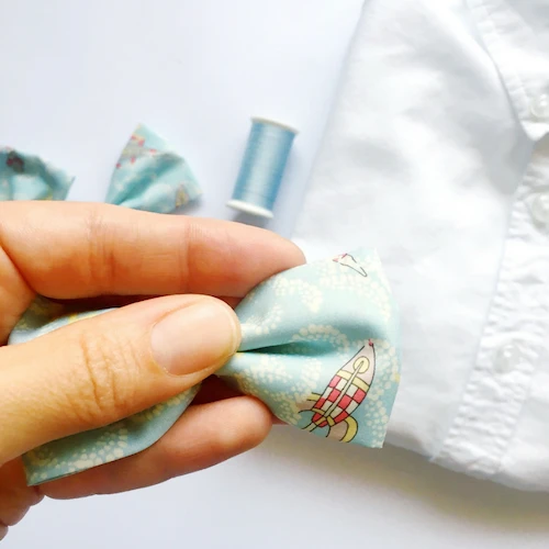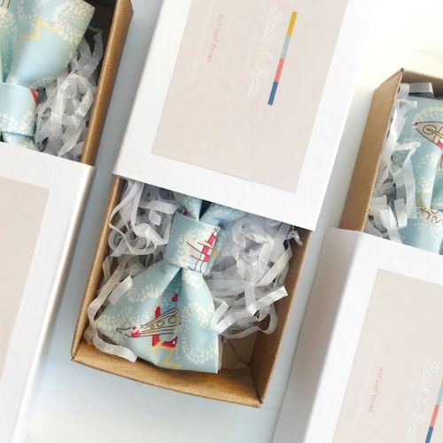 Each bow tie is carefully hand-sewn and securely ready to be fastened to the top front button of the shirt.