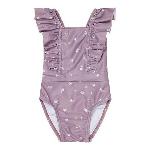 Sea you at the beach! With this floral swimsuit you will be the shining star at the shore. This one-piece bathing suit combines Mauve Blossom with great style and finesse. The fit is comfortable and the flounces on the shoulder bands add a sophisticated touch. Your little diva will love the swimsuit in Mauve Blossom with romantic flounced details on the shoulder straps. It is made from UV protective recycled polyester and is available in sizes 62/68, 74/80, 86/92 and 98/104. Pair with a mom bag to bring all beach essentials, such as a bath poncho and most importantly, sunscreen lotion to protect your little one.