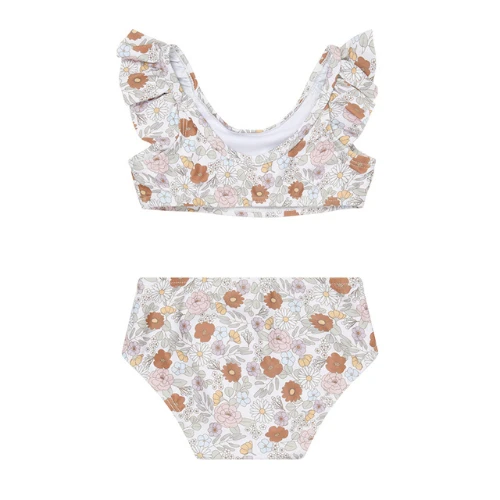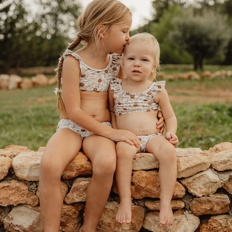 Swim or flaunt?! This two-piece bikini with flounced shoulder straps is perfect for both! The fit is comfortable for swimming and playing all day. And the trendy design will make this your favourite summer outfit. The ruffled shoulder straps add an adorable touch of style to the multi-coloured bikini set covered in Vintage Little Flowers. The set is made from UV protective recycled polyester and is available in sizes 62/68, 74/80, 86/92 and 98/104. Mix and match the bikini top and bottoms with the ruffle bikini bottoms or long sleeved rash guard from the Vintage Little Flowers collection to stay on trend all summer long. Don’t forget to always use sunscreen lotions to protect your little one.