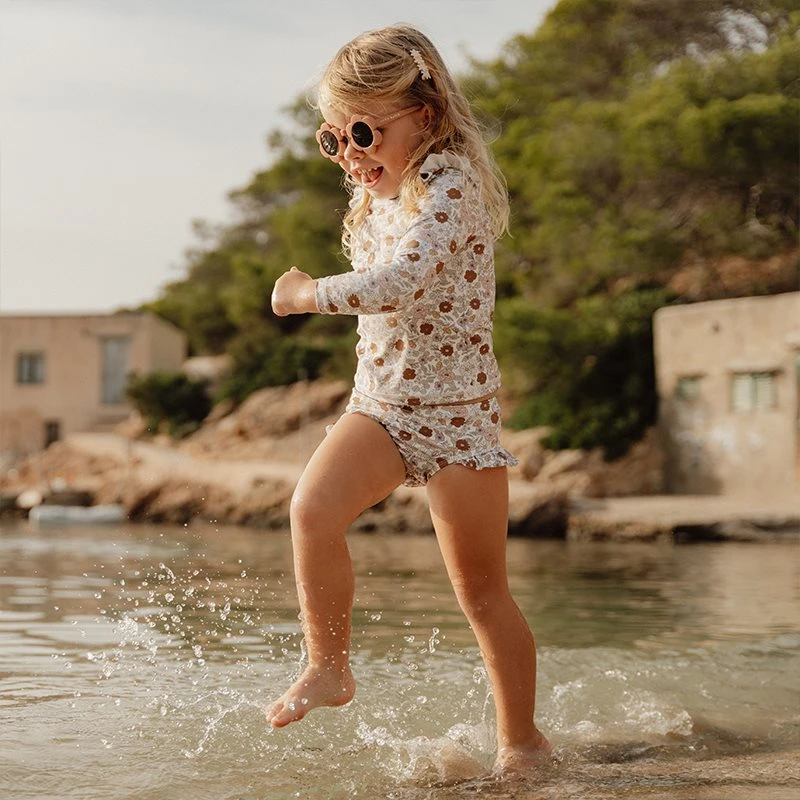 Let’s make a splash in style! This long-sleeved rash guard will keep you warm in the water and protect you from the sun while you play all day long. Whether you love to surf the water or float around in a swim ring, this shirt is the perfect choice for summer activities at the seashore. The trendy Vintage Little Flowers and ruffles on the shoulders add a touch of style to your little one’s summer apparel. Thanks to the zipper closing on the back it’s not just pretty, but practical too. It is made from a UV protective recycled polyester and is available in sizes 62/68, 74/80, 86/92 and 98/104. Pair with the matching bikini ruffled short for a coordinated look. Don’t forget to always use sunscreen lotions to protect your little one