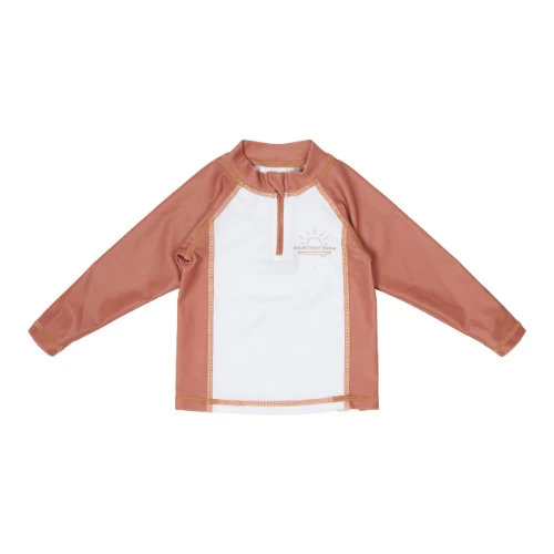 The sun is shining so let’s go! Grab your long sleeved rash guard and pack your beach favourites for a day of water fun. This swim shirt will keep you warm in the water and protect you from the sun while you play all day long. Whether you love to surf the water or float around in a swim ring, this shirt is the perfect choice for summer activities at the seashore. In a combination of brown and off-white and a touch of sunshine, this rash guard with long sleeves from the Vintage Sunny Stripes collection gives your little surfer a cool beach look as well as a comfortable fit. Thanks to the zipper on the front it’s easy to put on and take off. Even when your little one is wet and covered in sand. The rash guard is made from UV protective recycled polyester and is available in sizes 62/68, 74/80, 86/92 and 98/104. Pair with the matching swim short for a coordinated look. Don’t forget to always use sunscreen lotions to protect your little one