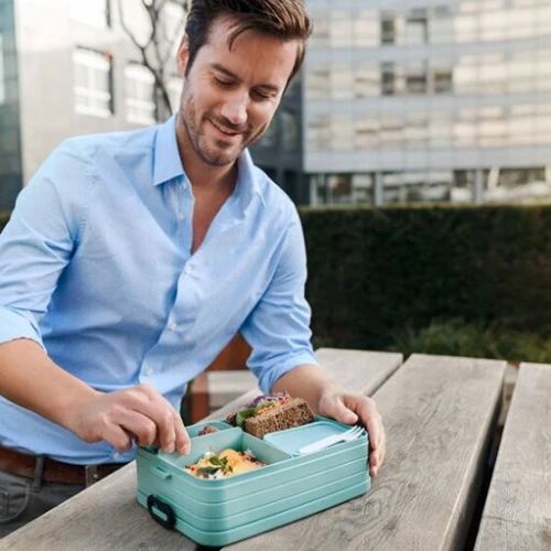 Lunch box Take a Break large in the color nordic green. This large lunch box from Mepal is suitable for a maximum of 8 sandwiches.