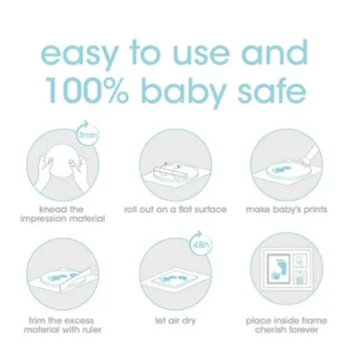 Pearhead photo and plaster prints frame is the perfect gift for any baby occasion. The set includes: one package of clay, a ruler, double-sided tape, a gray background board and a non-toxic pad. Instructions for creating hand or foot prints included. With space for photos measuring 8×8 cm. White photo frame and clay prints. Easily hangs on any wall with the hanger included or stands on any table with the stand on. 100% safe for the baby. Material: wood and glass.