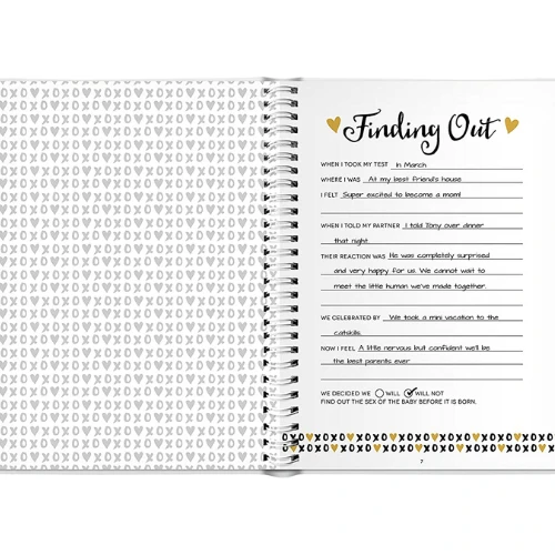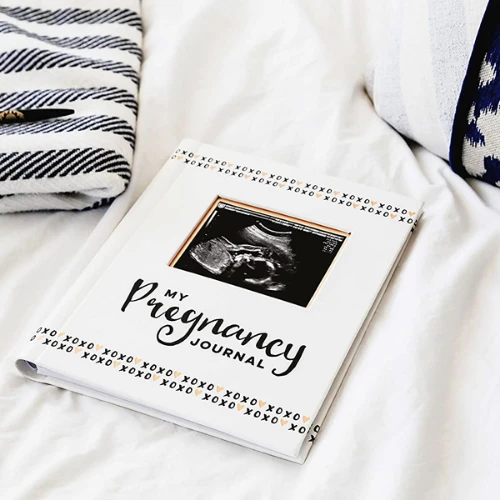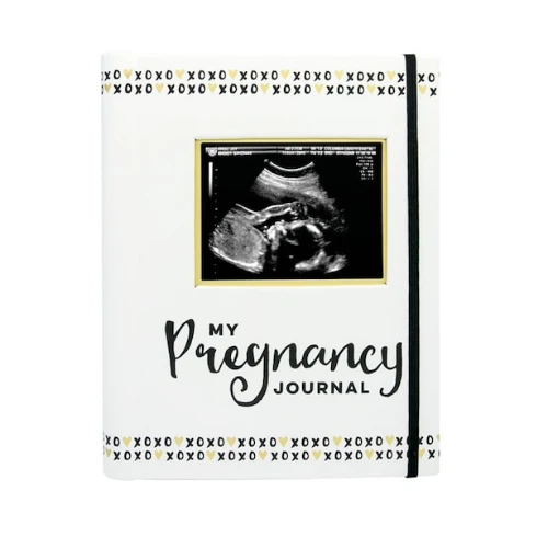 This guided memory journal is spiral bound and includes an elastic strap on the outside to secure your memories. “My Pregnancy Journal” is printed in black on the front of this white journal. Hearts are gold foil stamped and an “xoxo” pattern is printed in black and gold on the front and back of the journal adding a fun, modern touch. The memory book journal sports a cover made from polyurethane material which adds a faux leather touch. To add to the cuteness of this memory journal, you can display a 4″ x 5″ sonogram photo of your little pearhead on the cover. Never forget a moment of your pregnancy with Pearhead’s pregnancy journal.