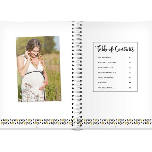 Sections include; “the big news,” “first doctor visit,” “first trimester,” “second trimester,” “third trimester,” “planning,” and “the big arrival.” Within each section there are pages to include your favorite pregnancy photos.